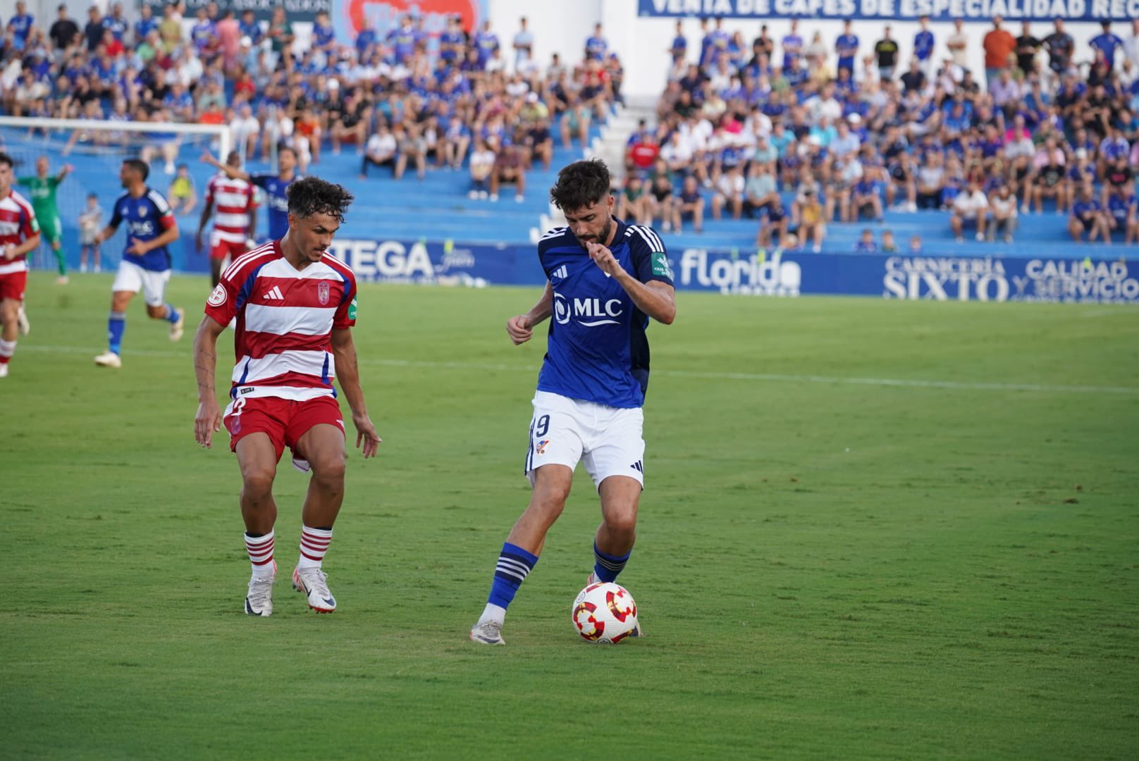 Los pupilos de Juan Antonio Milla han realizado una excelente primera parte, donde han aprovechado la expulsión del jugador del Recreativo de Granada por una durima entrada que tuvo que ser atendido por los servicios médicos del club y que a final acabo con puntos en la frente y con un vendaje en la cabeza del duro golpe recibido.
