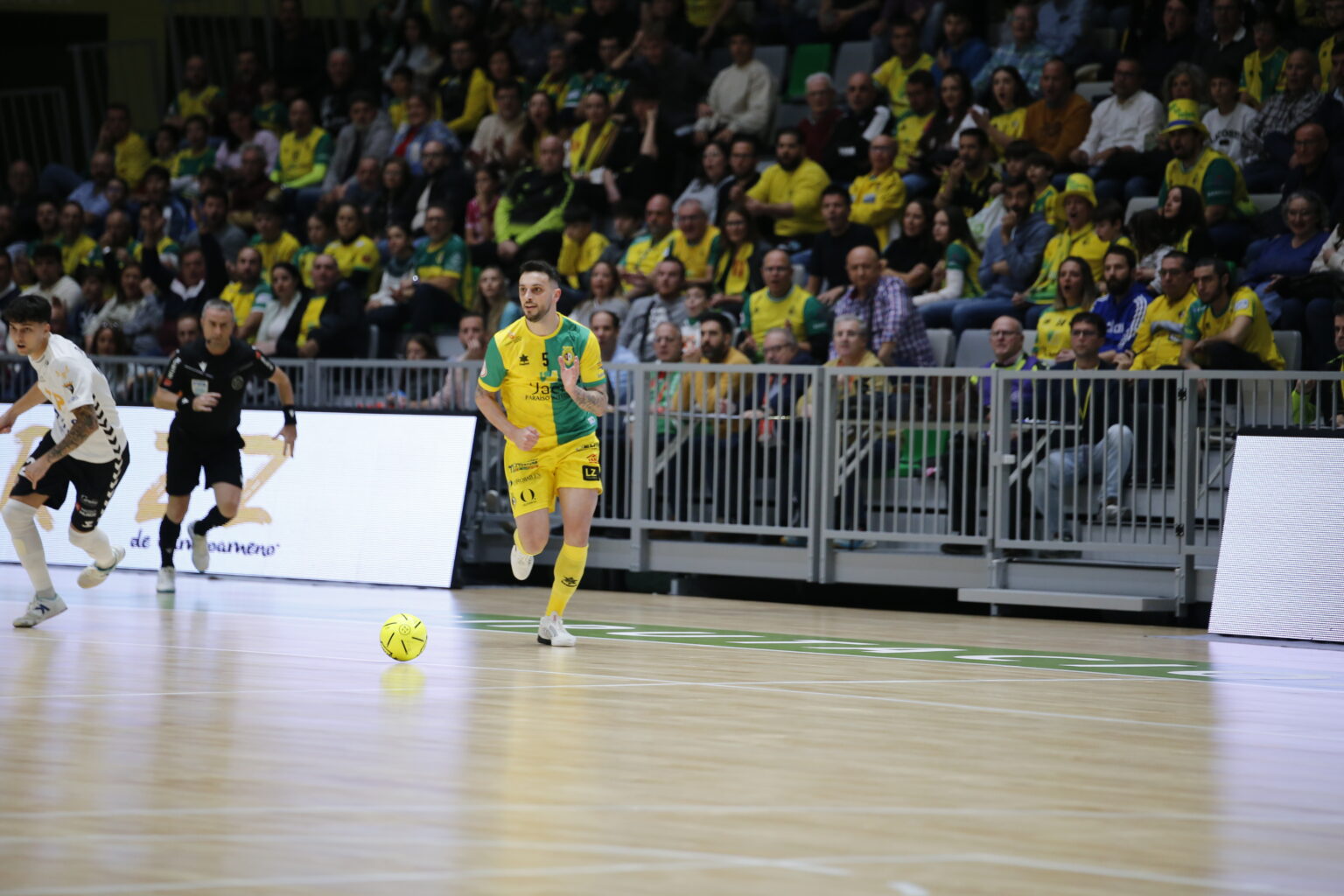 El inicio de la segunda parte empezaba igual que la primera parte, nos encontrábamos con que Alan aprovechaba un balón al segundo palo para hacer el cuarto y poner tierra de por medio. En el minuto 25 y coincidiendo con la buena dinámica del equipo, llegaba el peor momento del partido. Franklin sufría una lesión que dejaba en vilo al Olivo Arena. El silencio se hacía en el pabellón y los aplausos llegaban para nuestro jugador que se retiraba en camilla. A partir de aquí fue todo cuesta abajo para el equipo dirigido por Dani Rodríguez. Guilherme en el minuto 27 y Lahuerta en el 31 ponían nervioso a un Palacio de los Deportes Olivo Arena que ya se veía venir lo peor. Con portero-jugador, Tripodi la ponía lejos de Espindola en el 37, y Éric Pérez un minuto después empataba el partido. Tras la remontada del equipo visitante, sacábamos portero-jugador para intentar llevarnos los tres puntos, el problema que iba a ser al contrario. Guilherme robaba un balón en defensa para lanzar un contraataque y que Lahuerta marcara el quinto de los visitantes a falta de minuto y medio. Solo quedaba intentar sacar un punto, y en un tiro de Chino, la desviaba Alan Brandi para empatar cuando solo restaban 5 segundos. Tras el empate a cinco, el árbitro pitaba el final y se repartían un punto para cada uno.
