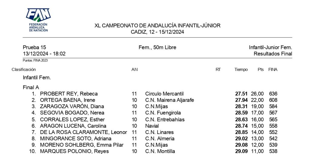 La nadadora Andujeña ha disputado una magnifica final donde ha estado muy disputada donde con la marca que ha obtenido se ha quedado séptima de Andalucía , quedándose a cincuenta y cuatro centésimas de la medalla de bronce.