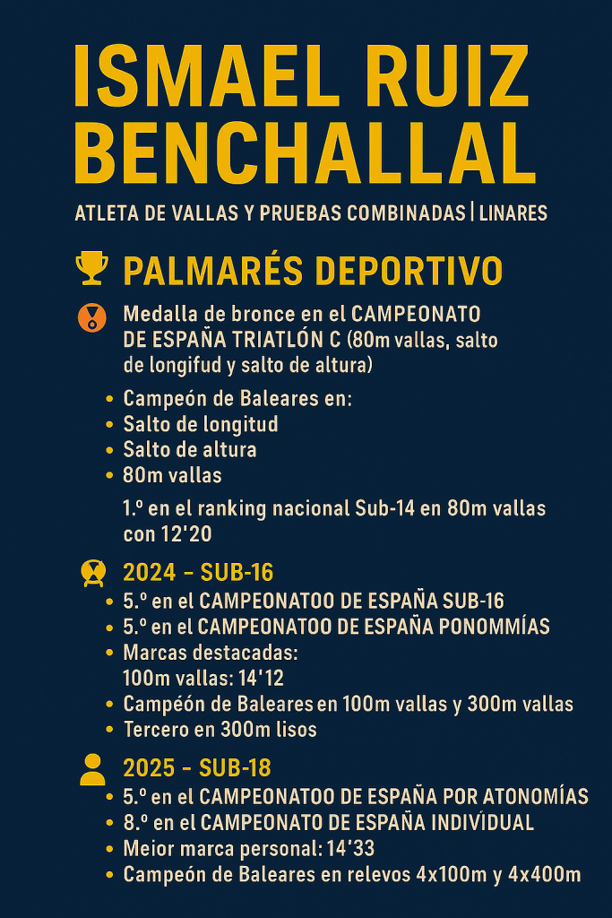 “Ismael Ruiz Benchallal se ha consolidado como uno de los grandes talentos del atletismo nacional, llevando el nombre de Linares a lo más alto. Su humildad, su ambición y su gran temporada auguran un futuro prometedor en la élite del deporte”.