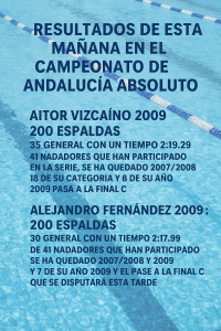 La tercera jornada del Campeonato de Andalucía Absoluto arrancó esta mañana con grandes emociones en la piscina, especialmente para la ciudad de Linares, que celebra el destacado desempeño de dos de sus jóvenes nadadores: Aitor Vizcaíno y Alejandro Fernández. Ambos han logrado el pase a la final C de los 200 metros espalda, mostrando talento y determinación frente a un nivel competitivo extraordinariamente alto.