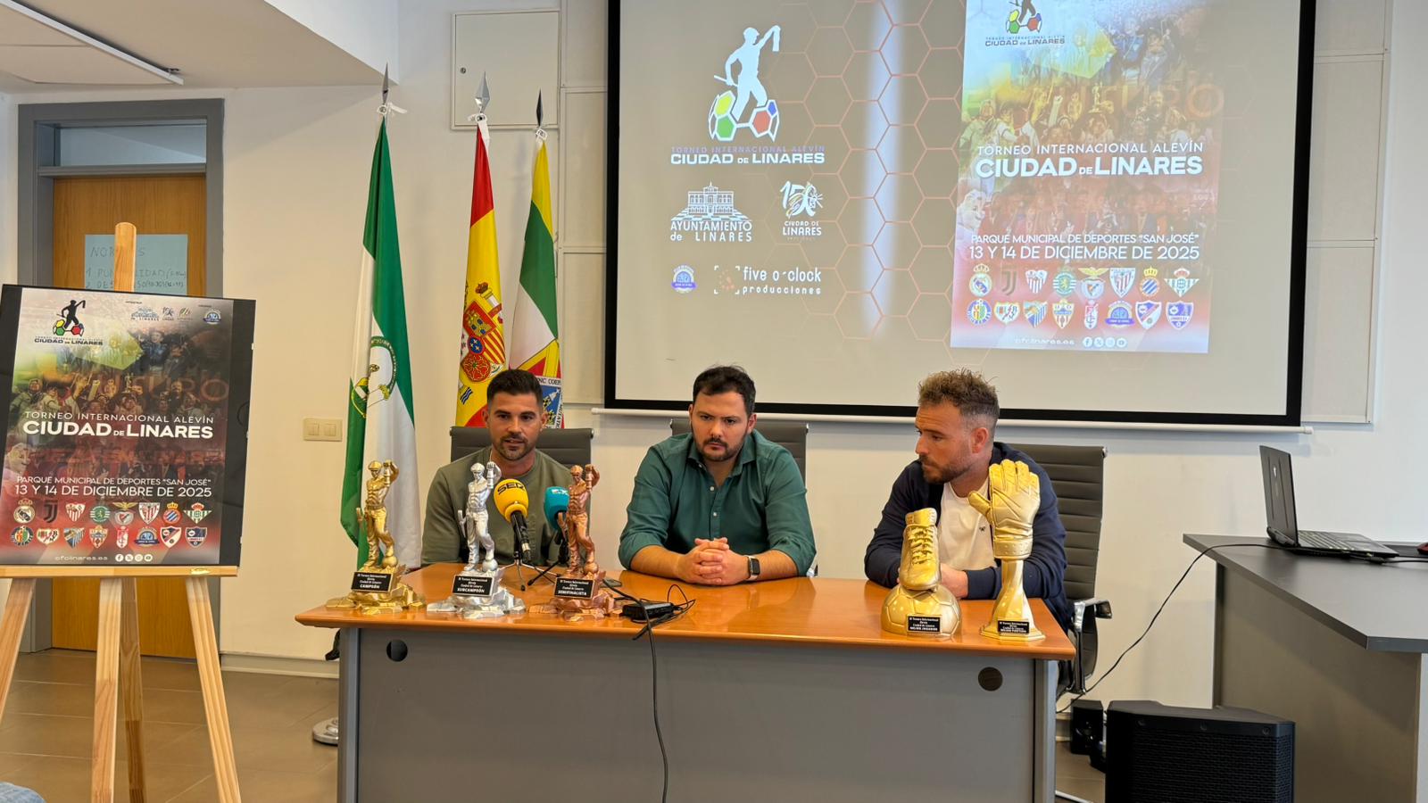 La concejalía de Deportes, junto a los organizadores del evento, el CF Ciudad de Linares, representado por David Rus y Javi Quesada, ha acogido esta mañana la presentación oficial del Torneo Internacional Alevín “Ciudad de Linares”, una de las citas más destacadas del fútbol base, que reunirá a algunas de las mejores canteras de Europa los próximos 13 y 14 de diciembre en el Polideportivo San José.
